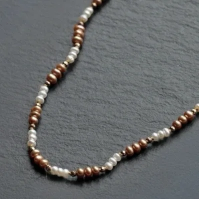 A delicate balance of warm and luminous tones, the Golden Blend Necklace pairs soft champagne pearls with petite white rice pearls, accented by subtle gold-tone mini hematine beads for a modern shimmer. The mixed textures create an effortless layered look in a single strand—refined yet playful enough for everyday styling. Finished with a classic clasp crafted from 925 sterling silver dipped in rich 24K yellow gold, this piece brings understated elegance to both casual outfits and dressed-up moments.