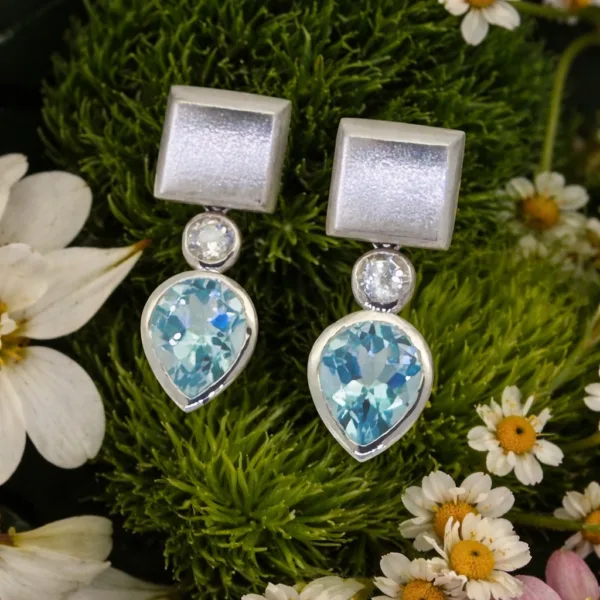 Suspended below, a luminous white topaz accent leads to a faceted blue topaz drop, reflecting light with crisp clarity and icy-toned radiance. Designed for versatility, the detachable construction allows the square studs to be worn alone for a minimalist everyday statement or paired with the gemstone drops for added movement and sophistication. Elegant, modern, and effortlessly refined, the Ice Prism earrings embody minimalist sophistication, offering a polished look that transitions seamlessly from day to evening.