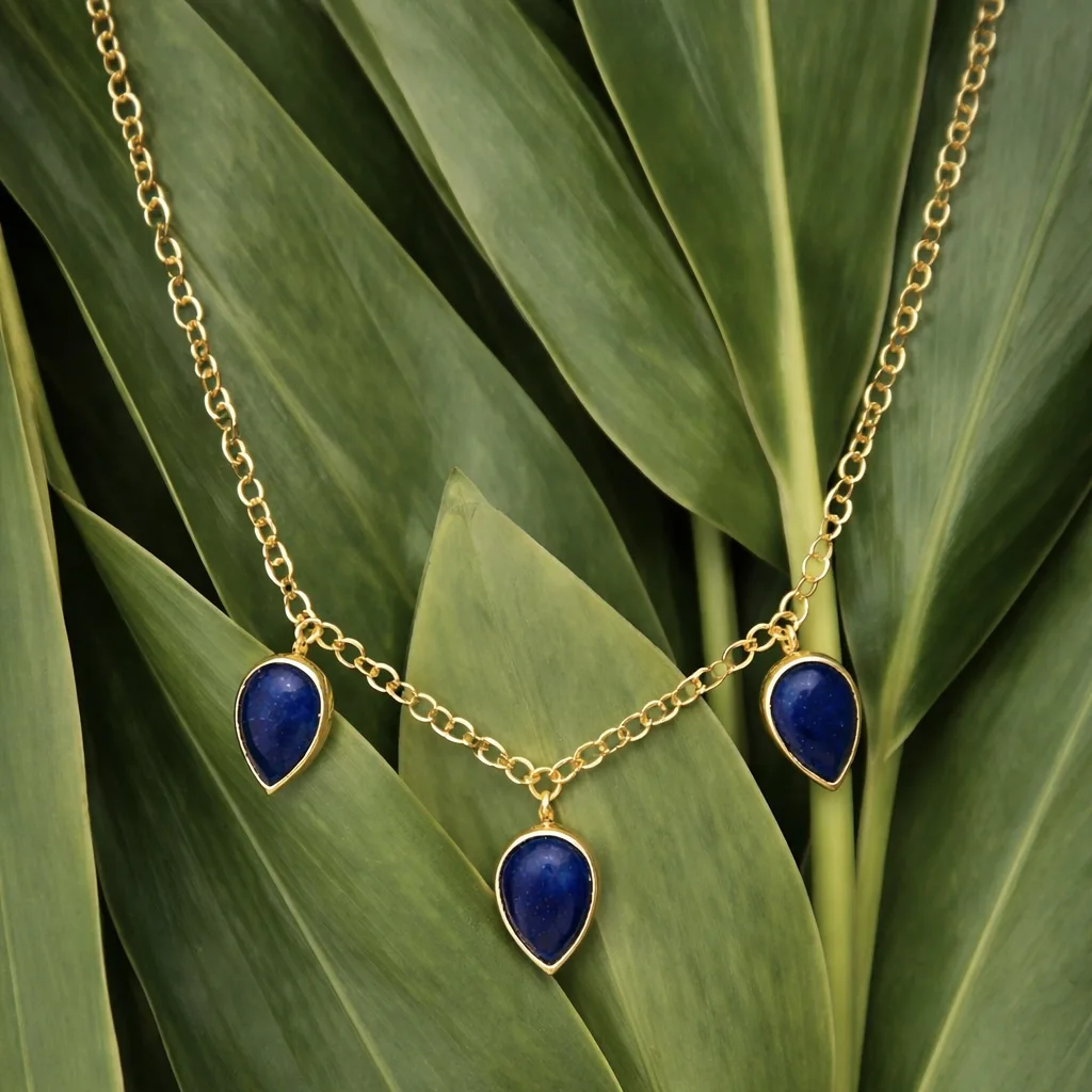 Elevate your everyday layers with a piece that blends timeless stone energy and modern minimal design. This necklace features three deep-blue lapis lazuli drops—each uniquely patterned with natural golden flecks—suspended along a delicate chain for a balanced, effortlessly cool silhouette.