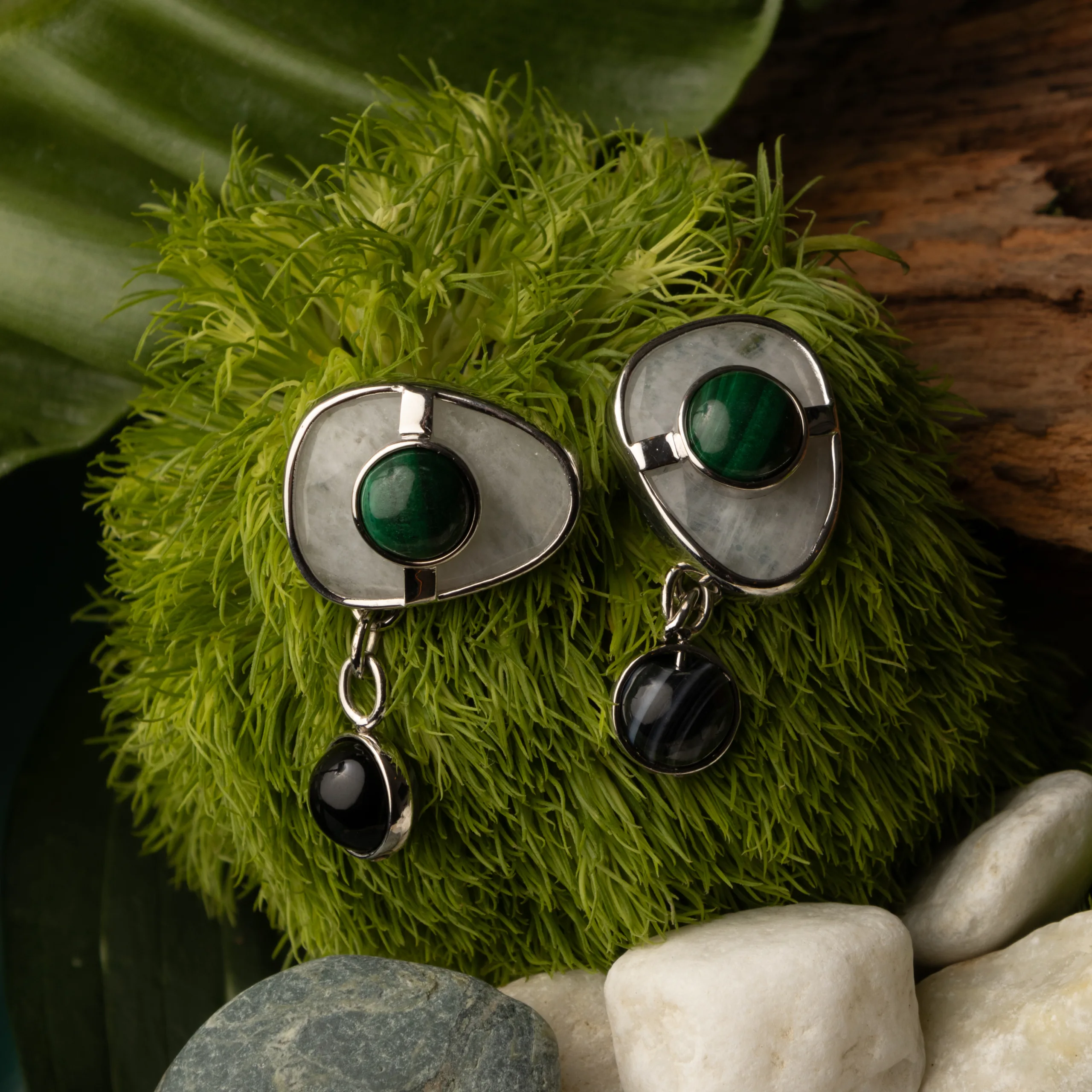 Surrounding the stone is a smooth inlay of moonstone, whose soft, milky glow adds a subtle luminescence that shifts gently with the light. Suspended below is a polished black striped agate bead, introducing depth and contrast while adding a hint of movement to the design.