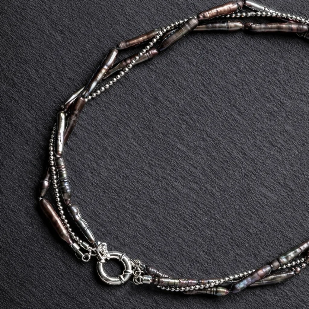 Meet your new statement essential. The Midnight Orbit Necklace blends sleek edge with timeless shine, featuring iridescent stick peacock pearls layered with mini hematine beads for a subtle metallic glow that shifts with every movement. The design is finished with a bold multi-loop lock crafted from 925 sterling silver dipped in rhodium, giving the piece a cool-tone polish that elevates both everyday fits and night-out looks.