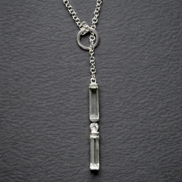 My soft green priasolite bars give fresh, minty energy, and the tiny white topaz in the middle throes just enough sparkle to catch attention (without screaming for it). My lariat drop moves with you, so every turn, selfie, and outfit change hits a little harder.