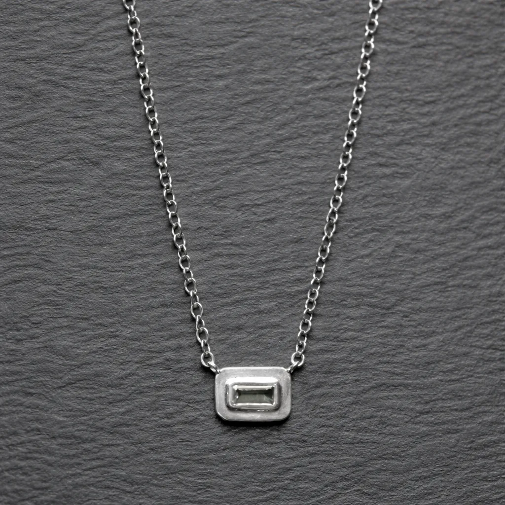 Fresh, clean, and effortlessly cool — the necklace features a luminous priasolite gemstone set in sleek 925 sterling silver dipped in rhodium, giving it that bright, mirror-like shine we love for everyday layering. The soft green sparkle catches the light just enough to stand out while still keeping your look minimal and polished.