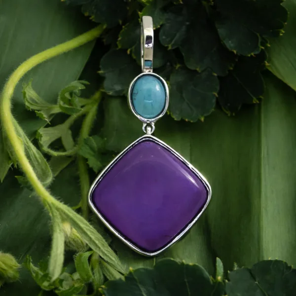 This elegant pendant showcases a harmonious pairing of cool blue apatite and velvety purple amethyst, united in a refined two-stone design. Set in 925 sterling silver dipped in luminous rhodium, the polished frame enhances the gemstones’ natural depth and brilliance while offering a sleek, enduring finish. The gentle contrast of color and the graceful silhouette create a piece that feels both contemporary and timeless—an understated expression of sophistication for those who appreciate quiet luxury and thoughtful design.