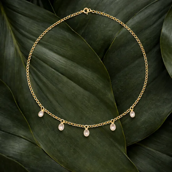 The chain is crafted from 925 sterling silver dipped in 24K yellow gold, giving it that rich golden shine while keeping it lightweight and perfect for everyday wear. Five dainty quartz drops add a subtle sparkle that moves with you, catching the light with every step.