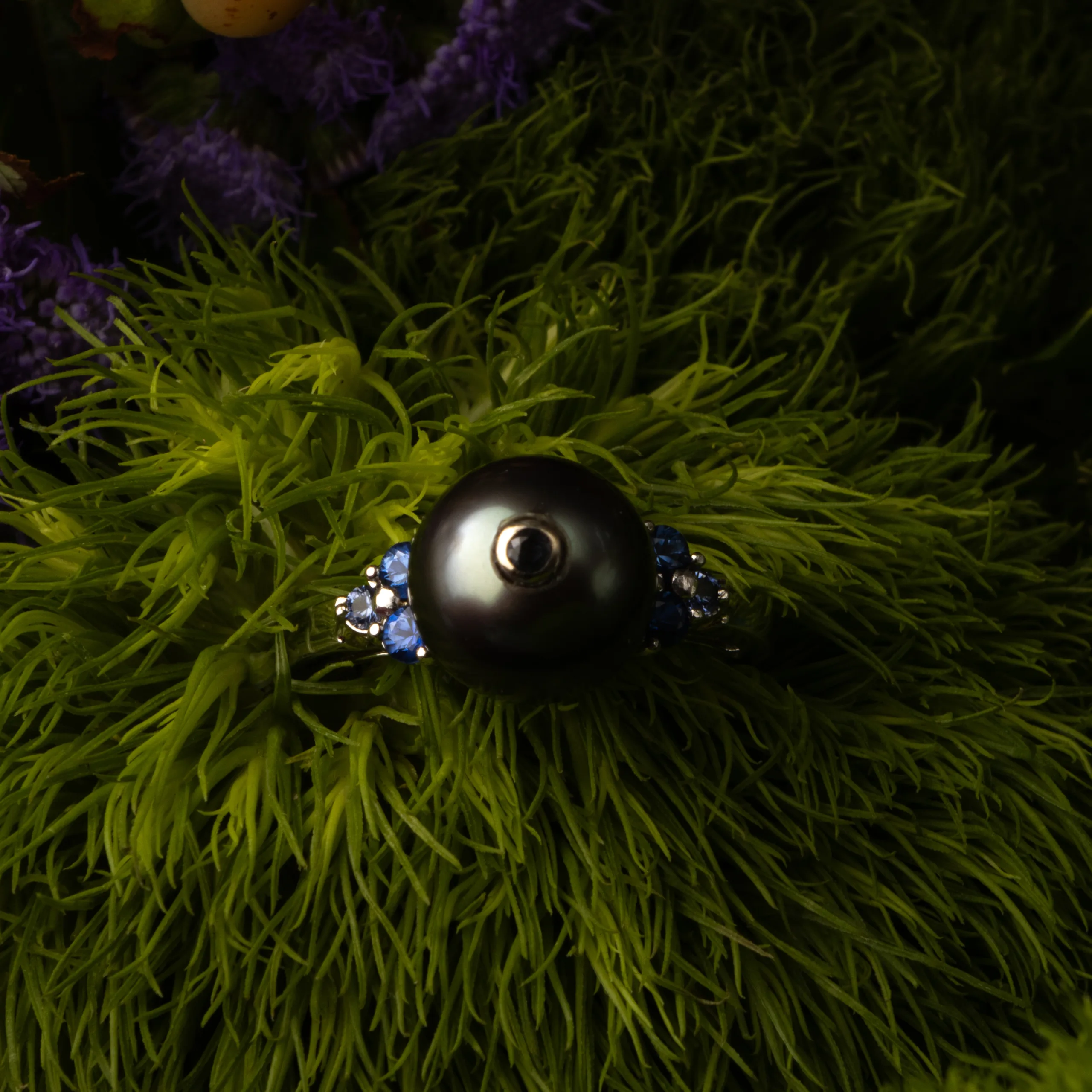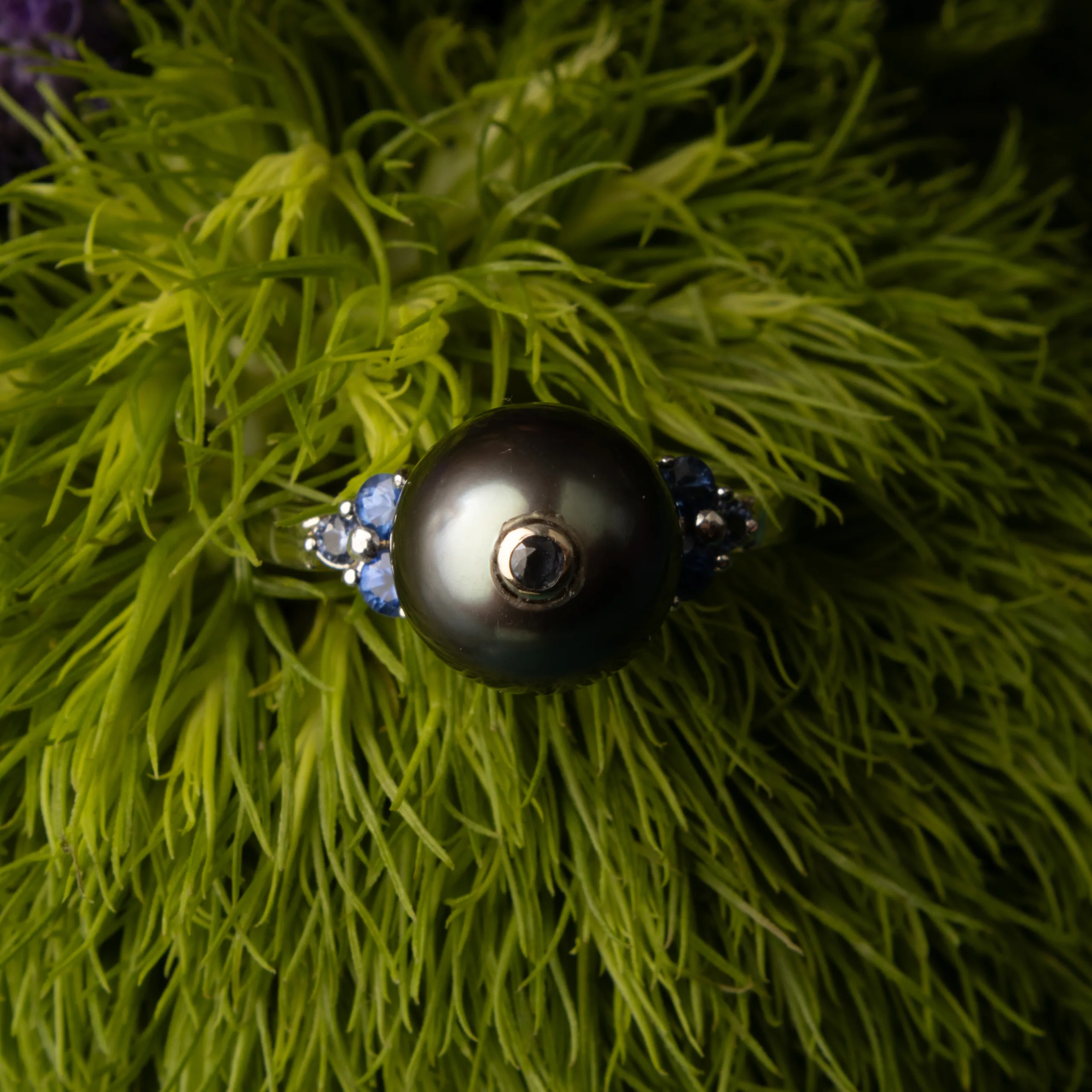 The design blends elegance with understated strength—classic in form yet distinctive in presence. The pearl’s rounded silhouette paired with the sapphire accents creates a harmonious composition that feels both timeless and modern.