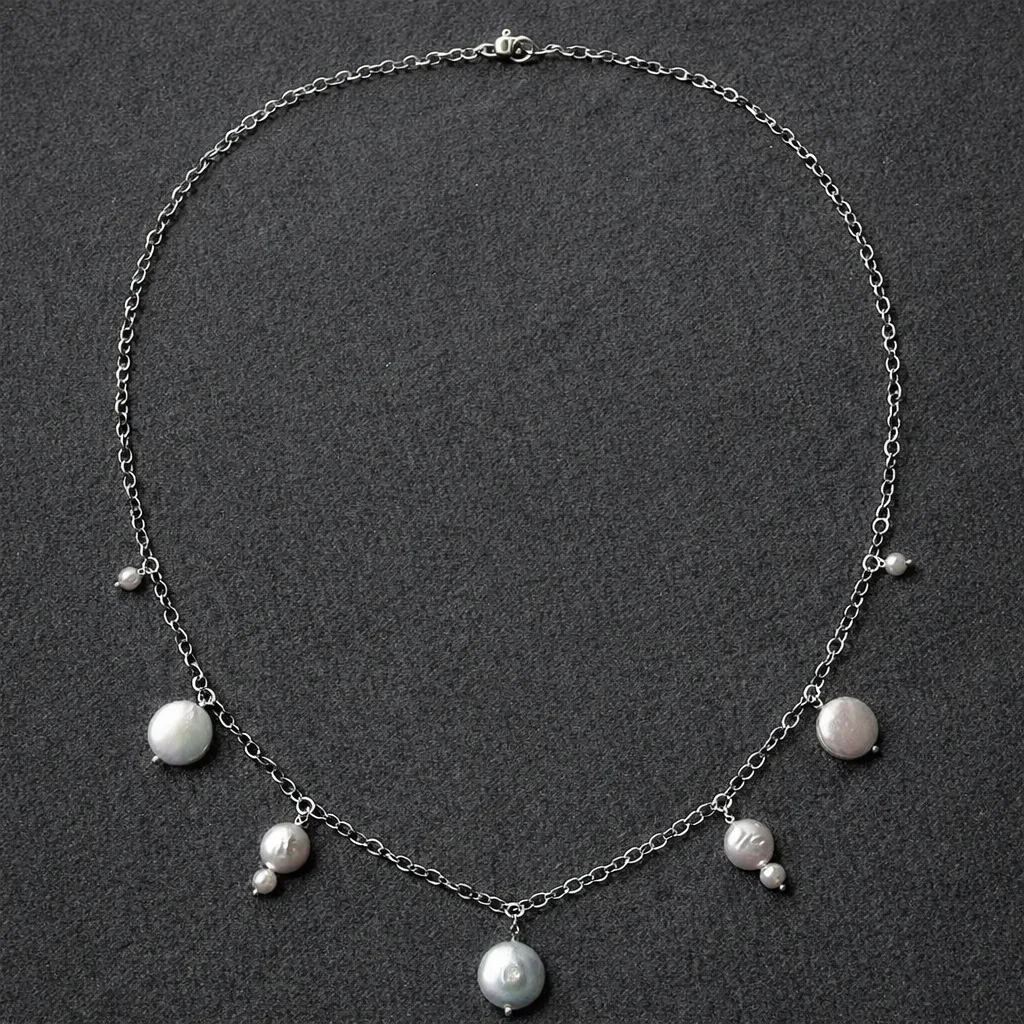 The Tala pearl necklace is all about subtle shine. Featuring luminous coin pearls and organic side baroque pearls, the design catches light from every angle — like tiny stars floating along a silver chain.