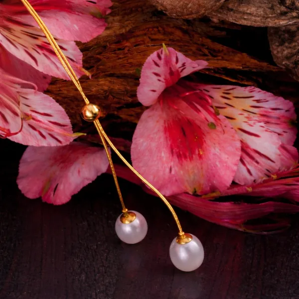 Effortlessly graceful, this necklace brings modern fluidity to classic pearl elegance. Slender golden lines—plated in radiant 24K yellow gold—cascade into a soft Y silhouette, ending in luminous freshwater pearl drops that sway gently with every movement.